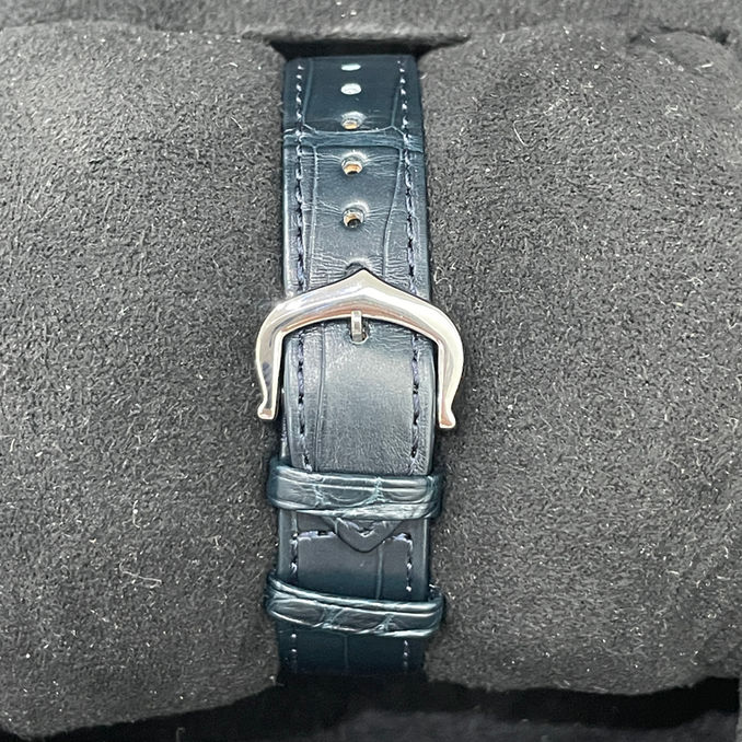 Reloj Santos-Dumont 1904. Louis Cartier cumple el deseo del célebre aviador brasileño Alberto Santos Dumont: leer la hora en pleno vuelo. Así nació uno de los primeros relojes de pulsera, sellando la amistad entre dos pioneros. Su esfera de ángulos redondeados, sus enganches de perfil armonioso, sus tornillos aparentes firman un reloj icónico que será objeto de múltiples reinterpretaciones. Reloj Santos-Dumont, tamaño pequeño, movimiento de cuarzo de alta autonomía (~8 años). Caja de acero, corona perlada decorada con un cabujón de espinela sintética azul. Esfera satinada plateada efecto rayos de sol, números romanos. Agujas de acero azulado en forma de espada. Cristal de zafiro. Correa de piel de aligátor color azul marino, hebilla de acero. Dimensiones de la caja: 38 mm x 27,5 mm. Grosor: 7,3 mm. Hermético hasta 3 bares (~30 metros).