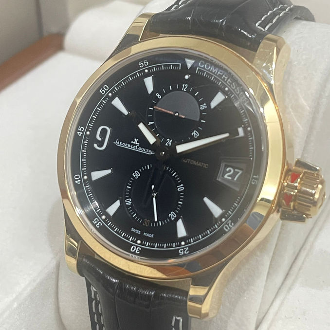 Jaeger-LeCoultre Master Compressor GMT Ref. Q1732441 (oro rosa 18K) — Reloj de lujo para el viajero exigente: caja de 41.5 mm en oro rosa, esfera negra con detalles rojos, y correa de aligátor con cierre desplegable en oro. Impulsado por el calibre automático JLC 975H (29 rubíes, 48 h de reserva), ofrece doble huso horario (GMT), fecha y el exclusivo sistema “Compressor” de coronas selladas que garantiza 100 m de estanqueidad. Un cronómetro de alta manufactura suiza que combina potencia, elegancia y sofisticación en una pieza lista para acompañarte a cualquier destino.