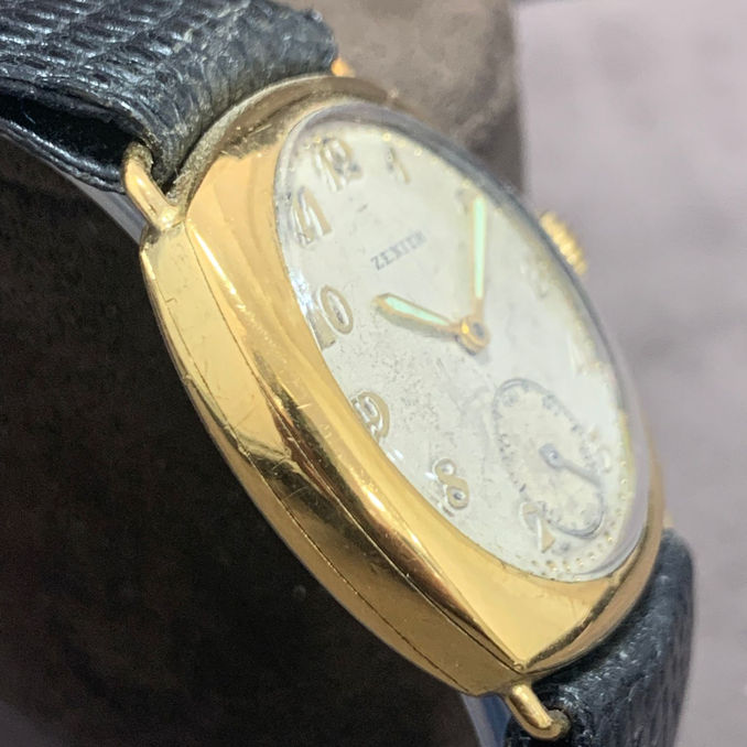 Este reloj Zenith vintage de cuerda manual, fabricado hacia finales de los años 40 o principios de los 50, representa una pieza clásica de la alta relojería suiza de posguerra. Con una caja chapada en oro amarillo de elegante forma cushion (cojín), este modelo conjuga una estética sobria con una construcción sólida y refinada. Su esfera color crema, con una pátina homogénea que denota autenticidad y paso del tiempo, presenta números arábigos aplicados en relieve de estilo Art Déco. Las agujas tipo dauphine acompañan la línea clásica del diseño, con un pequeño segundero a las 6 que acentúa el carácter tradicional del reloj. En su interior late el fiable y preciso calibre Zenith 126, un movimiento mecánico de cuerda manual con 15 rubíes y una reserva de marcha de 43 horas, reconocido por su durabilidad y simplicidad técnica. Este calibre fue muy utilizado por la marca en sus modelos de vestir en la década de 1940.